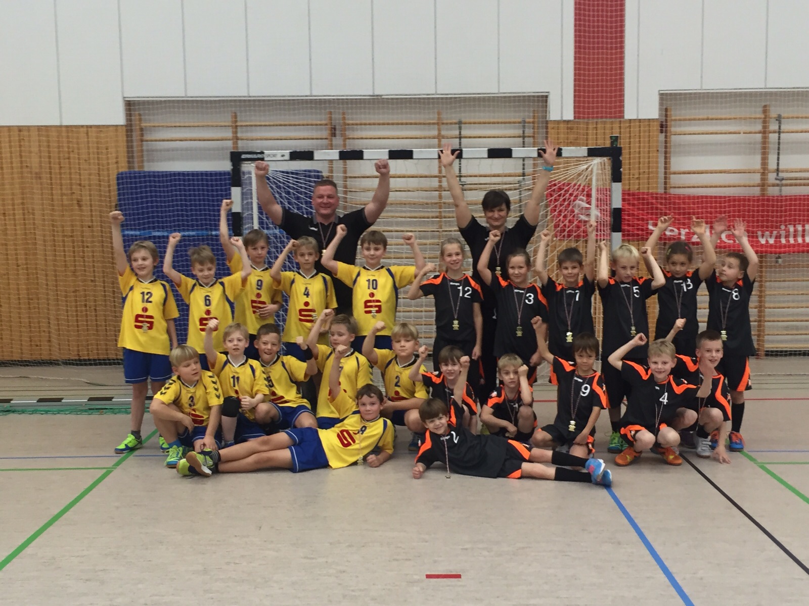 Die Kinder der Trainingsgruppen Nord und Süd hatten sich binnen kürzester Zeit aufeinander eingestellt und zusammen die Siege erkämpft. Bei der Siegerehrung wurden alle Minis mit einer schönen Goldmedaille belohnt. Vielen Dank an unsere Eltern, Omas und Opas, die lautstark ihre Kinder bei den Spielen unterstützten. Am Nachmittag verließen die Familien glücklich und stolz die Turnhalle. Das war ein schöner Handballtag.