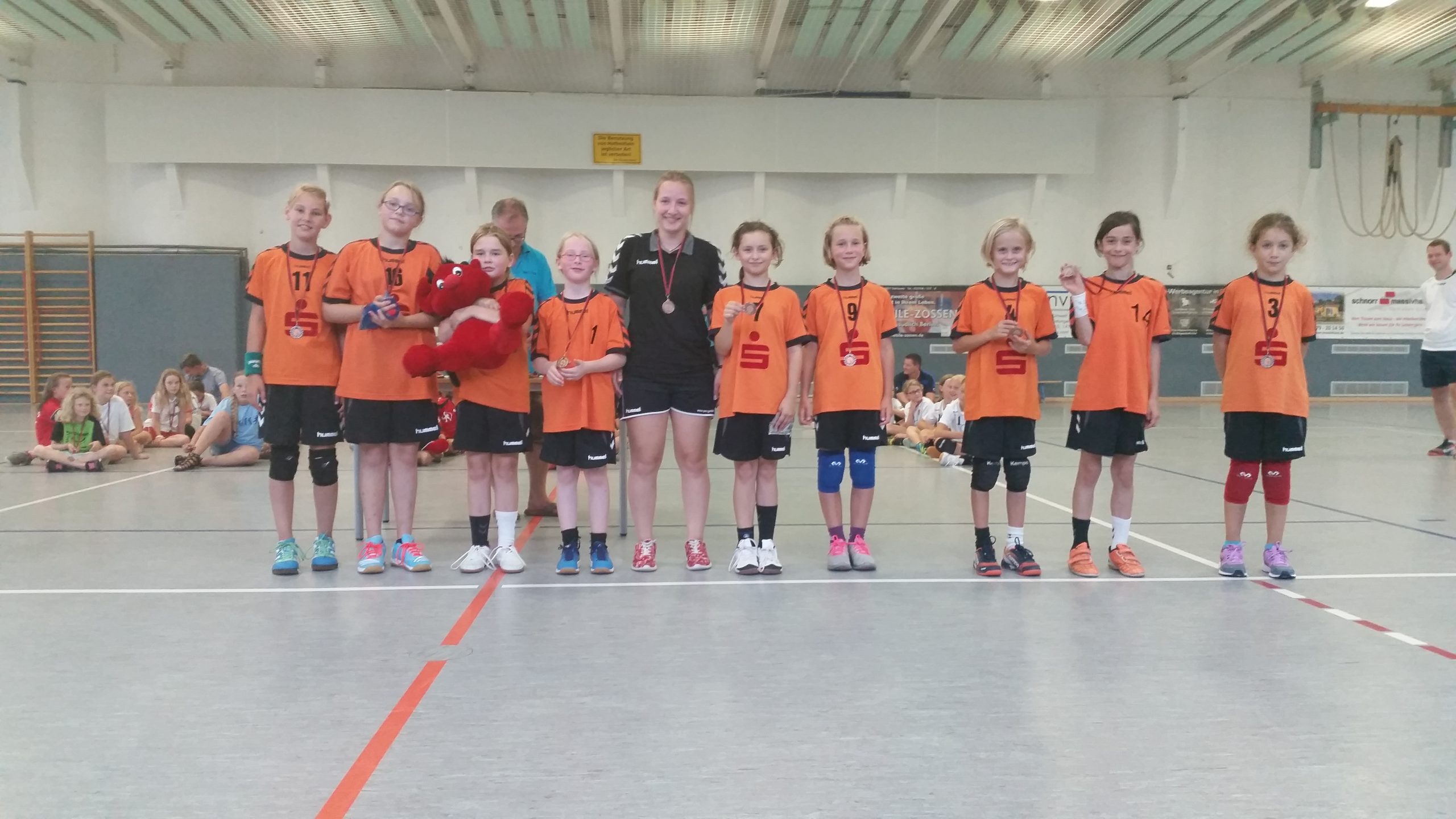 Nach etwas Aufbauarbeit ging es an die Spiele gegen Ahrensdorf/Schenkenhorst und HSV Wildau, die wir dann für uns entscheiden konnten und damit am Ende den 4. Platz von sechs Mannschaften erreichten. Das Schöne bei diesem Turnier ist, alle Mannschaften bekommen eine Medaille. Da war die Freude groß. Sehr gut integriert haben sich dabei unsere beiden „Neuen“ Linda und Pari, die von den Minis zu uns gestoßen sind.