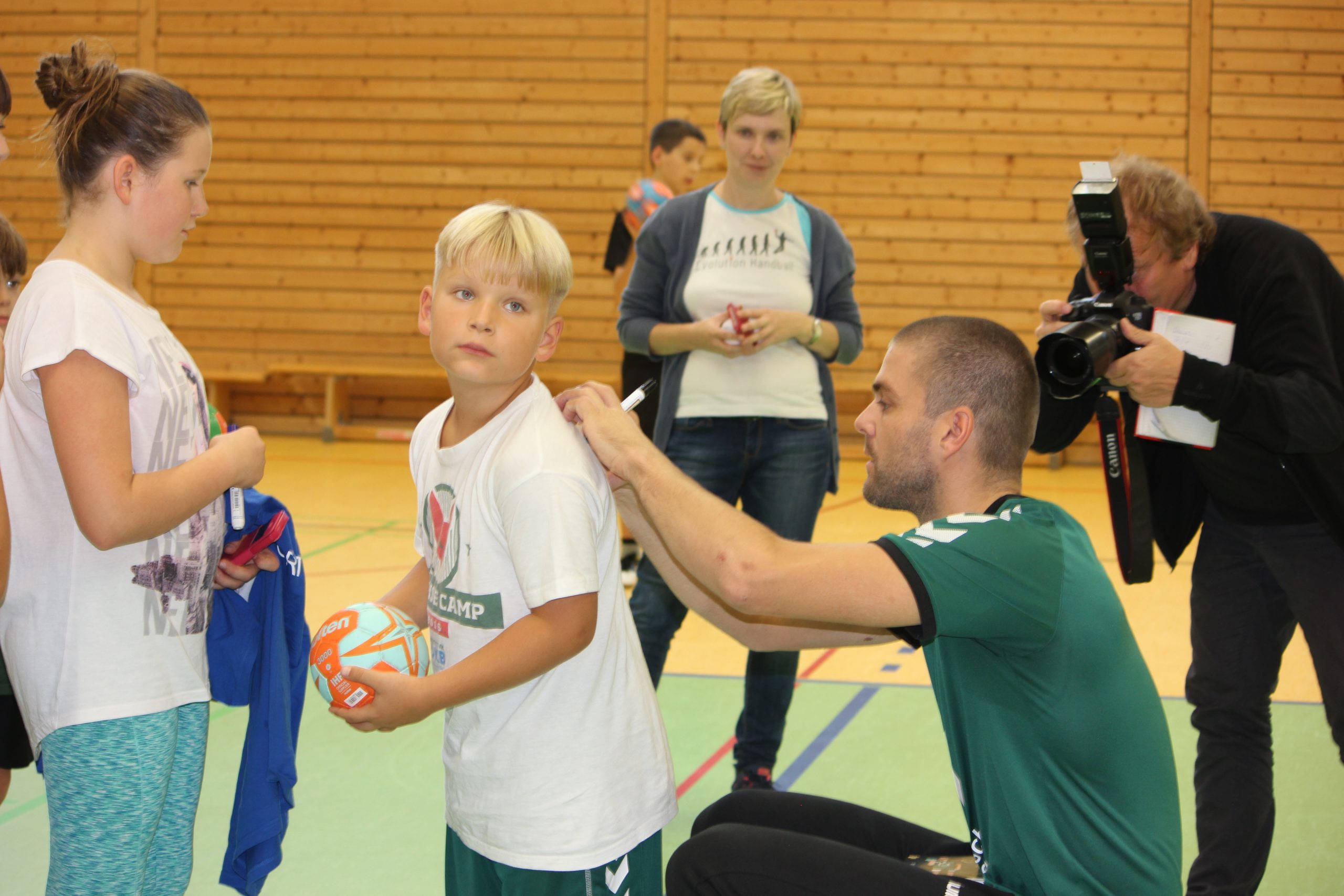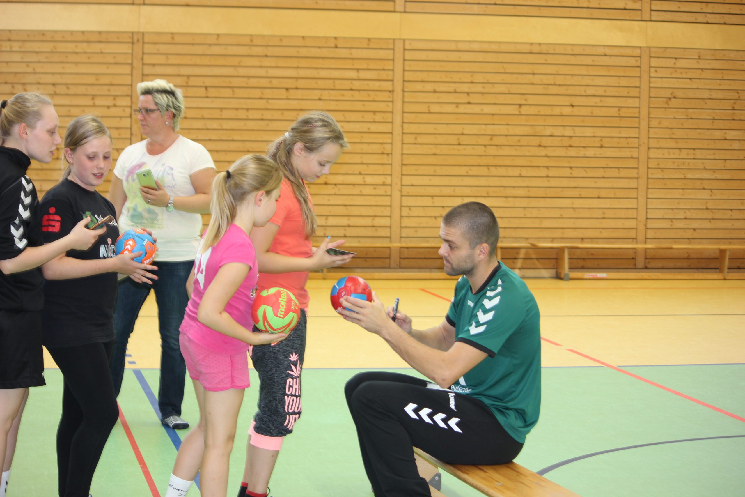 Nach einer Stunde handballspezifisches Training gab es eine Fragerunde. Die Kinder fragten: „Wie groß bist Du?“ ,“Wie weit kannst Du werfen?“und „Welche Trikotnummer hast Du?“ Geduldig antwortete Drago Vukovic gab noch gefühlte 150 Autogramme auf mitgebrachte T-Shirts, Handbälle und so einige Handballschuhe. Und natürlich durfte jeder der mochte noch Erinnerungsfotos mit dem sympathischen Spieler machen. Viel zu schnell war das Füchsetraining vorbei, fanden die Schüler der Vier-Jahreszeiten-Grundschule, wo Handball seit vielen Jahren eine große Rolle spielt. Durch gute Zusammenarbeit zwischen Schule und Verein konnten in diesem Jahr die Mädchen im Schulwettkampf „Jugend trainiert für Olympia“ den Landesmeistertitel erkämpfen. Darauf ist die Schule und die OSG sehr stolz und freuen uns auf kommende Wettkämpfe und handballbegeisterte Kinder!