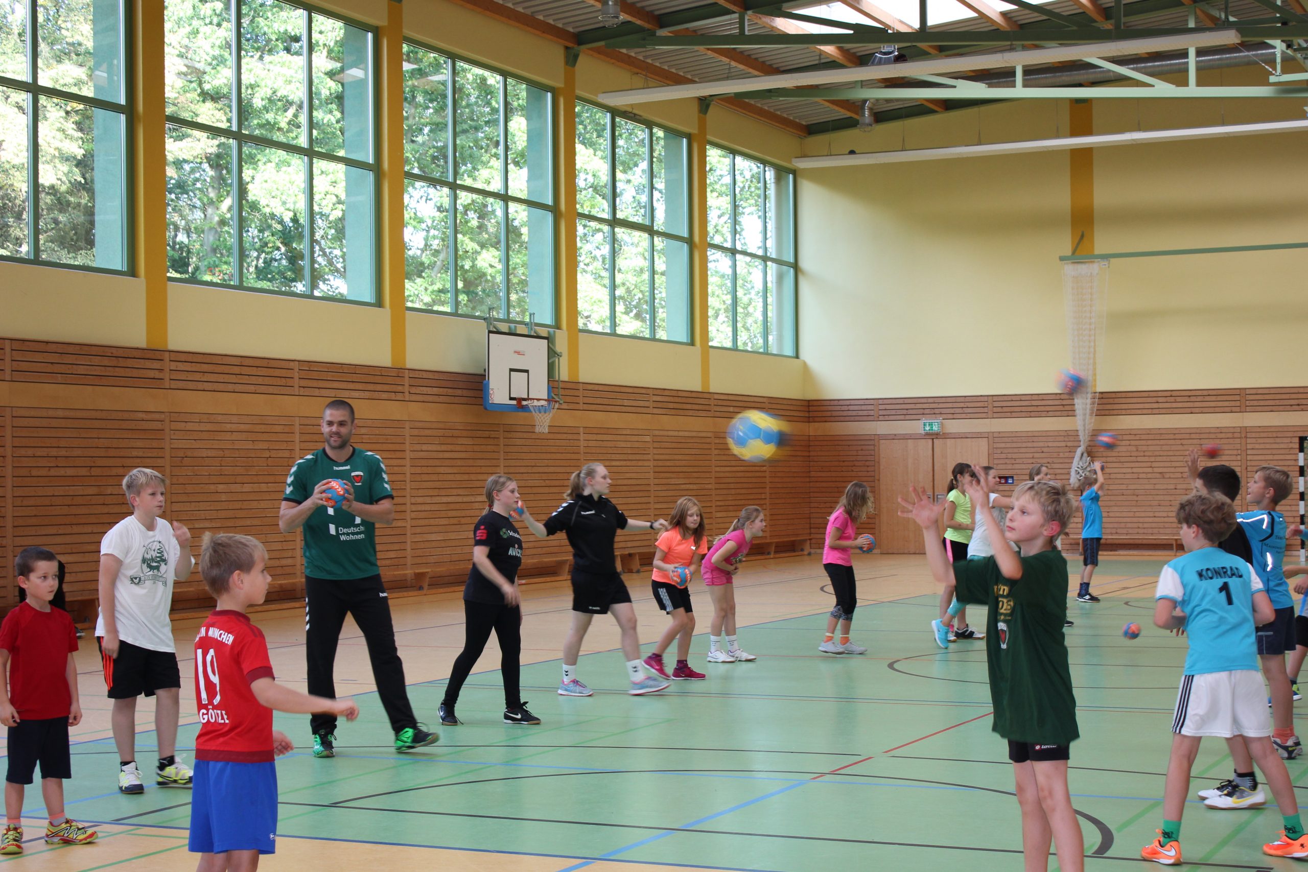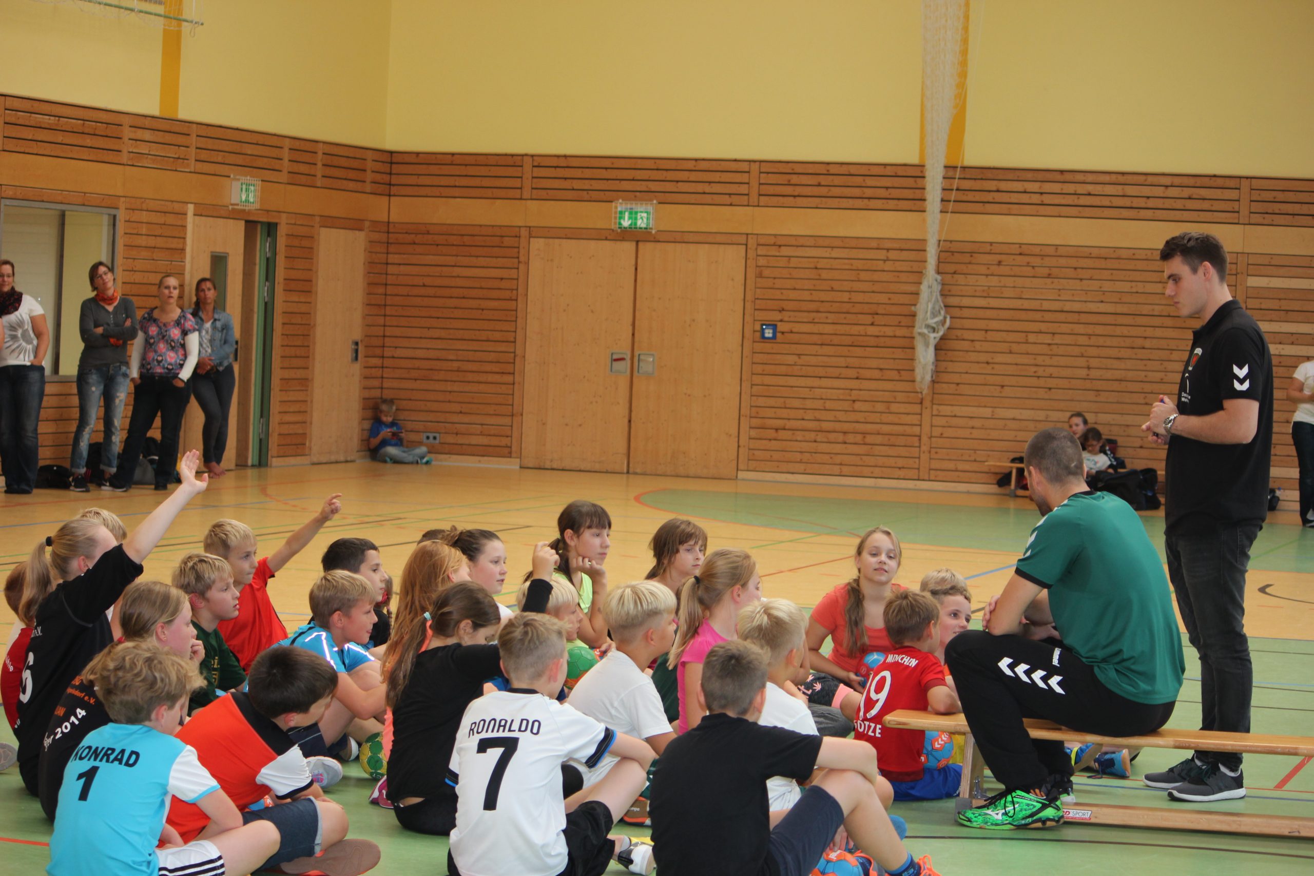 Am 21.09. 16 war es soweit, ca. 40 Kinder der Vier-Jahreszeiten-Grundschule, darunter viele Kinder unserer OSG Fredersdorf waren eingeladen zum Handballtraining mit dem Profispieler der Füchse Berlin Drago Vukovic und Lucas Altmann. Pünktlich 16.00 Uhr saßen die Schüler aufgeregt und mäuschenstill in der Turnhalle und warteten auf den Beginn.