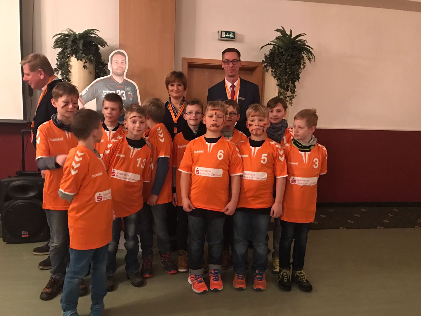 Durch die Sparkasse MOL , vertreten durch den Filialleiter von Fredersdorf Herrn Patowsky, wurde unserer E Jugend ein neuer Trikotsatz gesponsort und übergeben. Dafür möchten wir uns herzlich bedanken! Ein weiterer Höhepunkt war die Vorstellung der neuen OSG-Hymne: Ein Spielervater der Em sprach uns im Herbst an, ob unser Verein schon eine Hymne hätte. Als wir dies verneinten, machte sich der Papa Dr. Bernd Benser mit seiner Band STAGE DIVERS an die Arbeit. Zusammen mit den Bandkollegen komponierten sie eine Hymne und sangen diese mit den Kindern in der Vier-Jahreszeiten-Grundschule ein. Dadurch haben die Kinder zu diesem Song einen ganz besonderen Bezug, sie lieben ihn, er wird nun vor Spielen für die nötige Motivation und mentale Stärke der OSG-Teams in den Kabinen und Turnhallen sorgen. Weiterhin sponsorte Herr Dieter Eisermann von der Firma PEES eine neue Musikbox, mit der nun unkompliziert und schnell die ganze Halle für die Handballspiele mit Musik oder per Micro für Ansagen beschallt werden kann. Die Hymne und die Musikbox sind ein schönes Gesamtpaket, dass nun Pep in unsere Heimspieltage bringen wird, vielen Dank dafür!