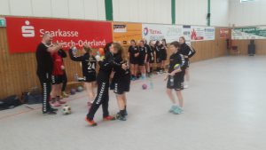 Lea im Tor benötigte aber leider auch 20 min bis sie im Spiel drin war, zu viele Tore fielen von rechts außen, so ergab sich zu Beginn ein offener Schlagabtausch (2:1, 5:4, 8:10, 12:12, 15:15). Vorn mit zwei Kreisläufern agierend, funktionierte auch dieses nun immer besser.