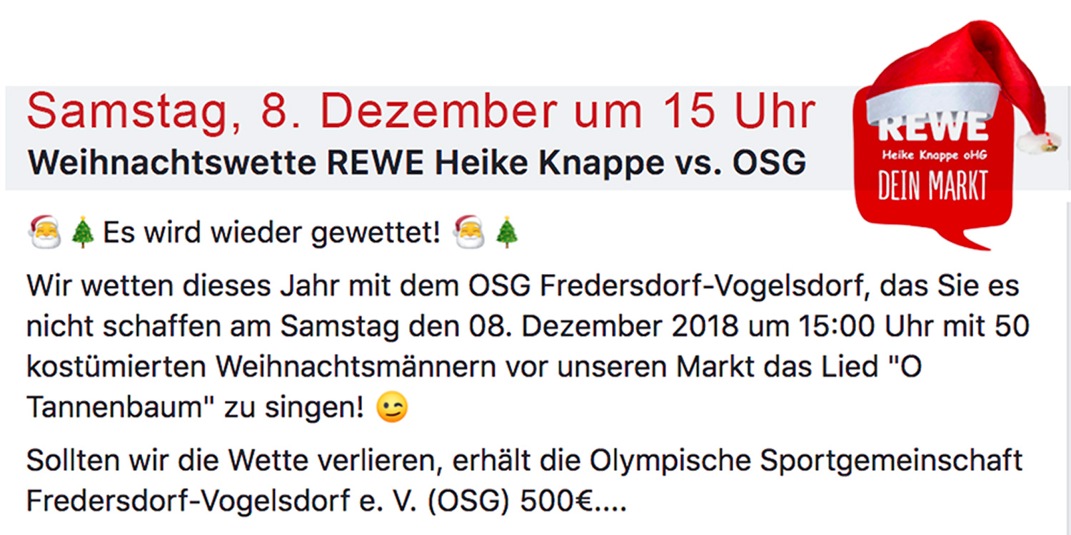 8. Dezember / 15 Uhr – Weihnachtswette REWE Heike Knappe vs. OSG 5. Dezember 20185. Dezember 2018 OSG OSG