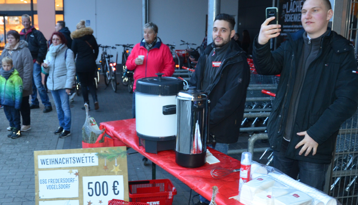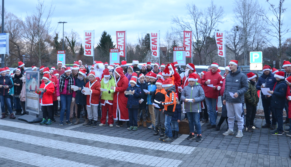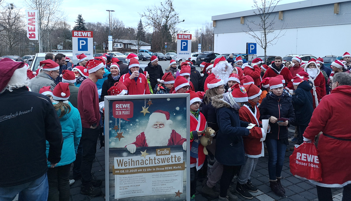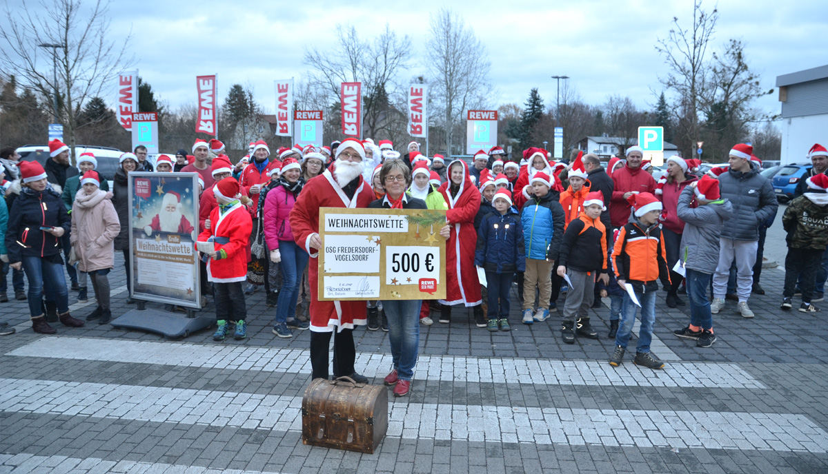 Am Samstag, den 9.12.2018, lud REWE „Heike Knappe oHG“ unseren Gesamtverein zu einer kleinen Wette ein. Sollte wir es schaffen, mindestens 50 verkleidete Weihnachtsmänner zu Rewe in Fredersdorf zu locken, die vor Ort „Oh Tannenbaum“ singen, bekäme die OSG Fredersdorf-Vogelsdorf e. V. dafür als Wetteinsatz 500,- Euro von Rewe gespendet.