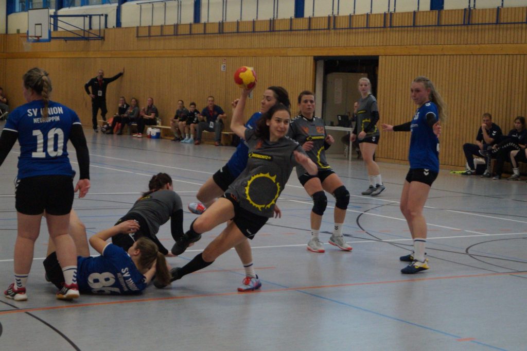 Das die Partie gegen den Tabellenverfolger keine leichte Aufgabe war, machte der Spielbeginn klar. Beide Mannschaften bewegten sich auf Augenhöhe, bevor sich Mitte der ersten Halbzeit die OSG Tor um Tor absetzen konnte. Vor allem die ebenso beherzt wie stabil agierende Abwehr, einschließlich einer gut aufgelegten Manou im Tor konnte die Trefferquote von Neuruppin erheblich dämpfen. Und auch vorne lief es! Tina und Anja glänzten mit viel Übersicht und setzten ihre Mitspielerinnen gekonnt in Szene, so dass Romy, Julia und Zoe mehrfach einnetzen konnten. Auch das 1 gegen 1 wurde nicht gescheut, was allein in der ersten Hälfte sechs Siebenmeter zur Folge hatte, die Romy souverän verwandelte. Die immer sicherer werdende Abwehr konnte zudem zahlreiche Ballgewinne für sich verbuchen, so dass Tempogegenstöße zum Torerfolg führten. Mit einer 15:10 Führung zur Halbzeit ging es in die Kabine.
