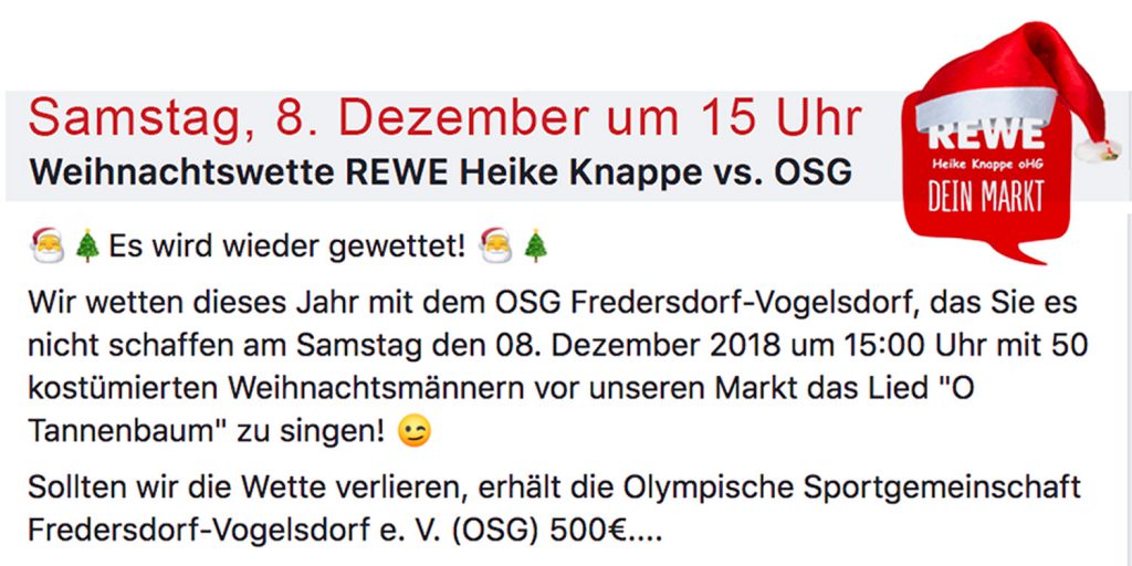 Am Samstag, den 9.12.2018, lud REWE „Heike Knappe oHG“ unseren Gesamtverein zu einer kleinen Wette ein. Sollte wir es schaffen, mindestens 50 verkleidete Weihnachtsmänner zu Rewe in Fredersdorf zu locken, die vor Ort „Oh Tannenbaum“ singen, bekäme die OSG Fredersdorf-Vogelsdorf e. V. dafür als Wetteinsatz 500,- Euro von Rewe gespendet.